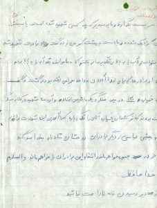 من با دلي پرشور از ايمان و با دلي سرشار از اسلام به جبهه مي روم و مي خواهم به دشمن با خونم ثابت كنم كه دنيا فناپذير است. پس چرا آخرت فناناپذير را رها كرده و دنياي فاني را برگيرم و آخرت به اين خوبي به هدر برود. مي دانم وقتي كه شهيد شوم از خونم هزاران لاله و از هر لاله هزاران شهيد شاهد به وجود مي آيد و خونم آنقدر به جوش مي آيد كه كاخ ستمگران را نابود كند. مادرم تو ساية عمر مني و مي دانم كه طاقت دوري فرزندت را نداري ولي چون راه راه اسلام است بايد تحملش را داشته باشد و در آخر از همة عزيزان حلاليت مي طلبم و التماس دعا دارم.