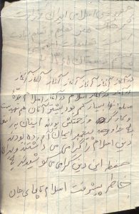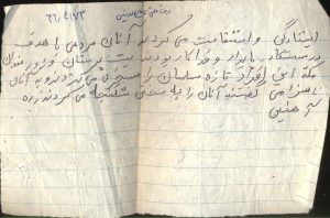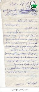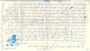 بنام ا…پاسدار حرمت خون شهيدان با درودبه رهبر كبير انقلاب و امت شهيد پرور ايران محضر مبارك همسر عزيزم سلام عرض ميكنم سلام عليكم پس از اهداء پرمحبتترين درودها نثار وجود نازنينت از خداوند متعال خواهان و خواستارم اگر از روي لطف پرسان حال اين حقير باشيد به شكر خدا سلامت هستم اميدوارم وجود نازنين شما نيز از جميع بليات سمائي و عرض مصون محفوظ باشد همسر عزيزم بعلت موقعيت نامعلوم نتوانستم نامه بنويسم لذا از حضورتان عذر ميخواهم اميد است كه حقير را ببخشيد نور چشمان عزيزم داود جانم را ميبوسم اميدوارم كه خوب درسهايش را بخواند انشاء ا… شاگرد اول شود حامد جانم را ميبوسم اميدوارم حال عزيزانم خوب باشد محضر مبارك مادر زن عزيزم سلام عرض ميكنم اميدوارم وجود شريف از جميع بليات مصون محفوظ باشيد خدمت پدرخانم عزيزم جناب آقاي خوبيار عطائي سلام عرض ميكنم اميدوارم كه حال مبارك خوب باشد خدمت عزيزان امير ماناء پرويز عصمت جواد سميه دانيال سلام عرض ميكنم اميدوارم كه همگي سلام باشيد.خدمت حسين با اله خانه و اسدا… با اهل خانه سلام ميرسانم ديگر عرضي نيست. خداحافظ