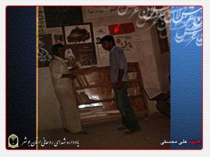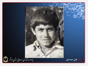 ضمن درود به رهبر کبیر انقلاب اسلامی ایران حضرت امام خمینی وصیت نامه را شروع می کنم این حقیر علی محسنی طلبه مدرسه محمودیه شیراز، ساکن قریه انارستان ریز بوشهر، با اختیار خود جهت رفتن به جبهه حق علیه باطل، چند کلمه ای به عنوان وصیت مینویسم اگر لطف خداوند شامل حالم شد و به شهادت نائل شدم حدالامکان مرا به زادگاهم انارستان ریز بوشهر، برگردانند و پس ازمراسم تشییع به مقبره امام زاده واقع در قلعه کهنه دفن کنند. ثانیا یک پیام به پدر مادر برادران و خواهرانم که شما باید برای رضای خدا کار کنید و هیچ گونه ناراحتی نداشته باشید که ما از خداییم و به سوی او باز می گردیم. بالاخص سفارش به مادر مهربانم که با کمال افتخار و شادی صبر و شکیبایی را پیشه ی خود قرار دهید. شهادت شیوه ی مردان خداست و جهاد دری است از درهای رحمت الهی که به بندگان ویژه خود عنایت می فرماید.